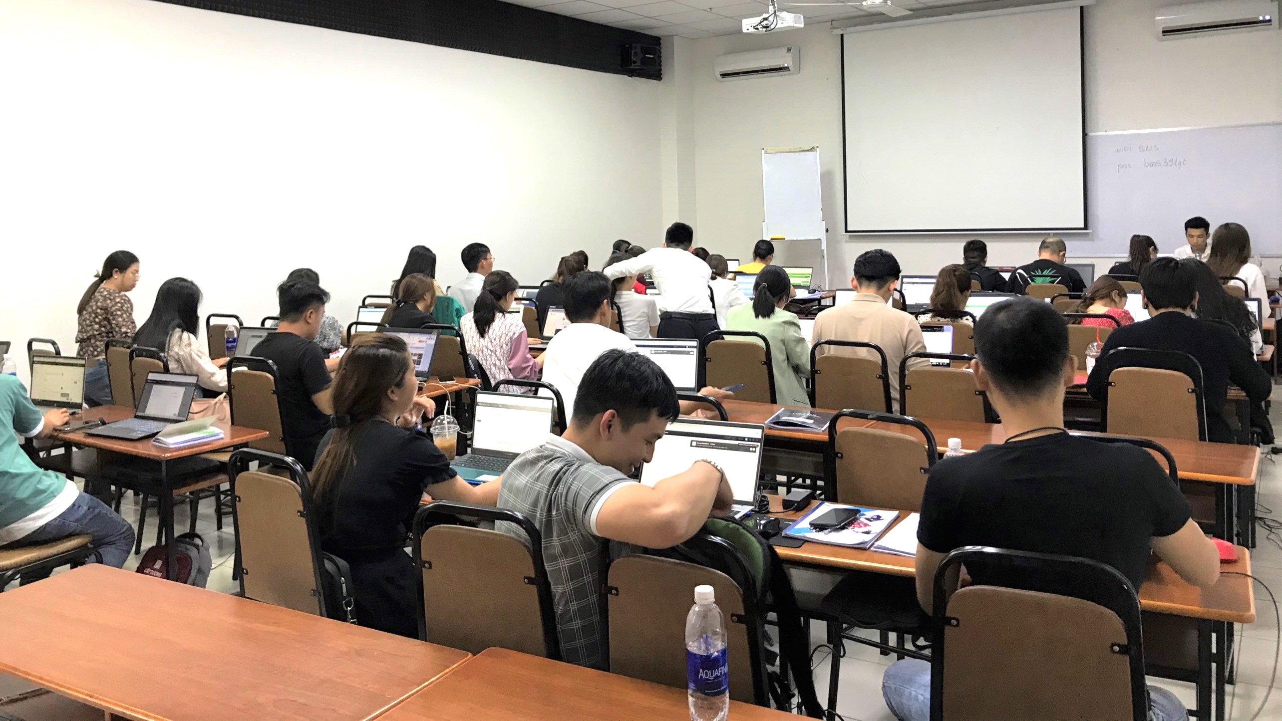 Hệ thống chiếu sáng, máy chiếu hiện đại, màn chiếu rộng, sáng và rõ nét.